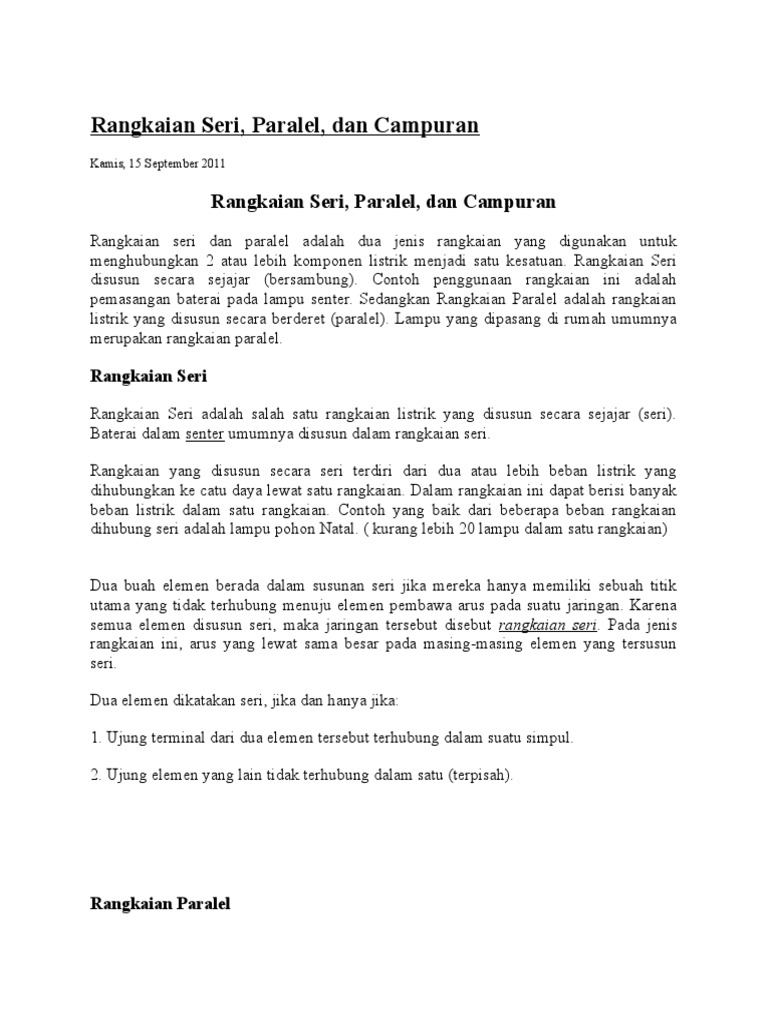 Pics. Contohnya adalah sebuah rangkaian yang memiliki dua resistor dimana terdapat satu jalur kabel untuk setiap resistor seperti pada gambar. Bahkan hampir semua kegiatan manusia memerlukan sumber listrik sehingga seolah olah listrik menjadi roda gigi dalam kehidupan sehari hari.